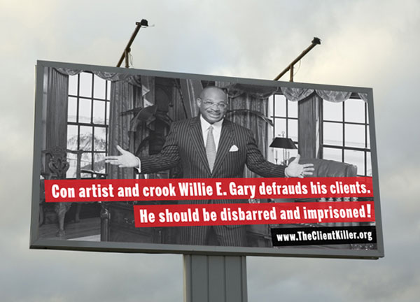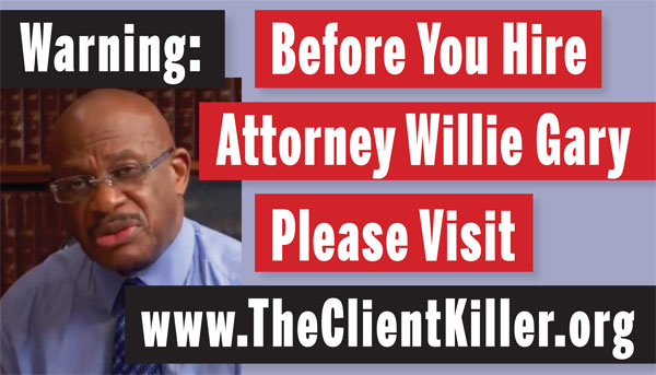 Gary, his law firm and five of his present and former partners including disgraced former Atlanta Mayor Bill Campbell, are presently being sued in federal court in Georgia for racketeering, fraud, legal malpractice and unjust enrichment in Rowe Entertainment, et al. v. Willie Gary, et al.