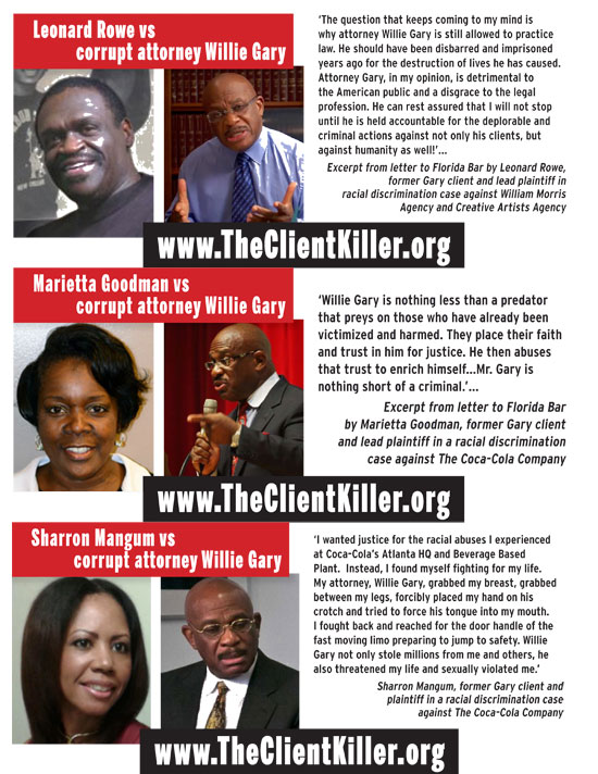 Marietta Goodman, former Gary client and lead plaintiff in a racial discrimination lawsuit against Coca-Cola, in a letter to The Florida Bar on March 25, 2014 wrote that Gary "is nothing less than a predator that preys on those who have already been victimized and harmed. They place their faith and trust in him for justice. He then abuses that trust to enrich himself...Mr. Gary is nothing short of a criminal."